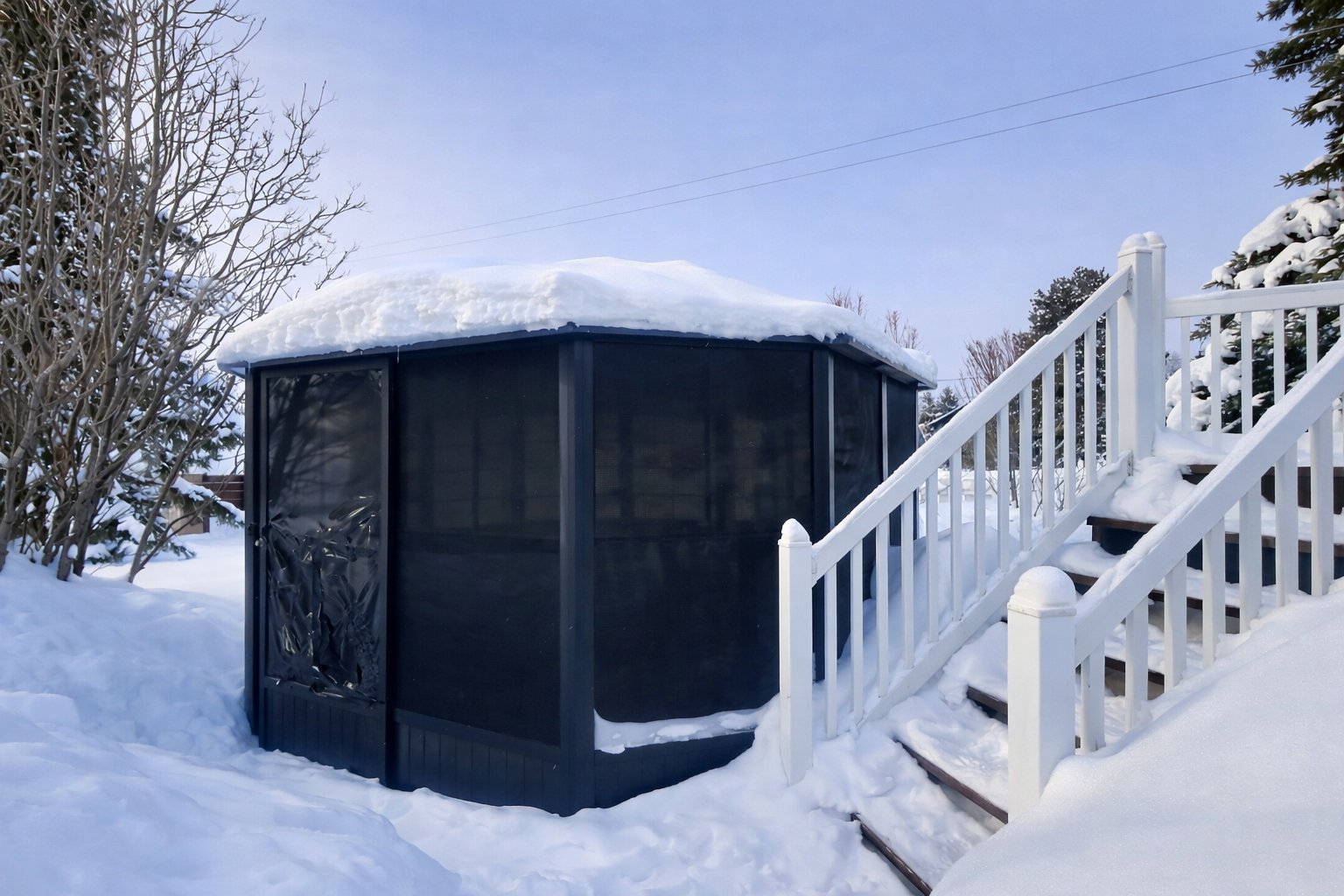 spa et ses accessoires, abri de spa, abris solaire pour le patio, aspirateur central et ses accessoires, frigo encastré dans la salle familiale, luminaires, toiles solaires, pôles à rideaux, bac bleu, bas vert, système d'alarme avec Telus (37 $ par mois)