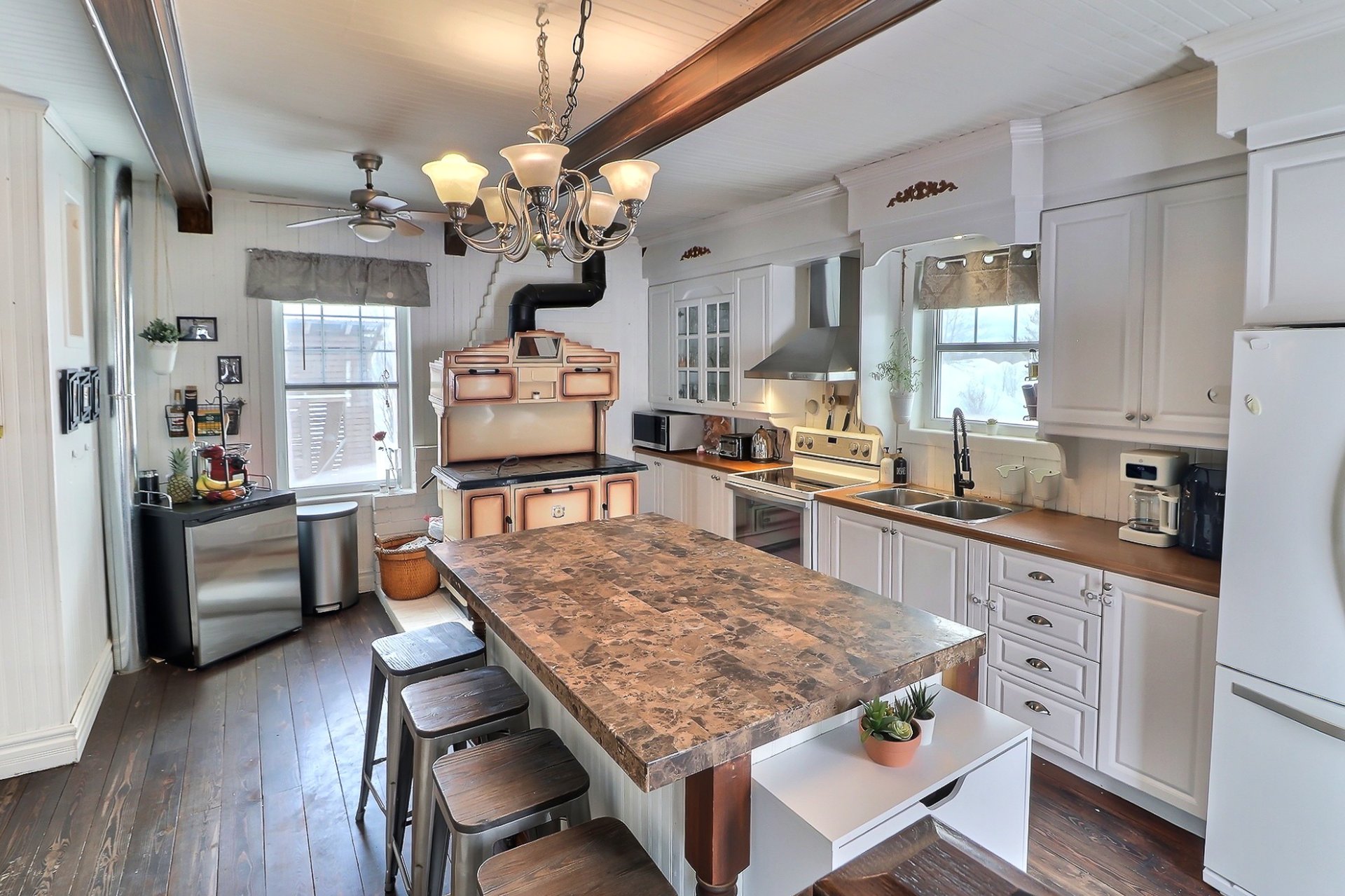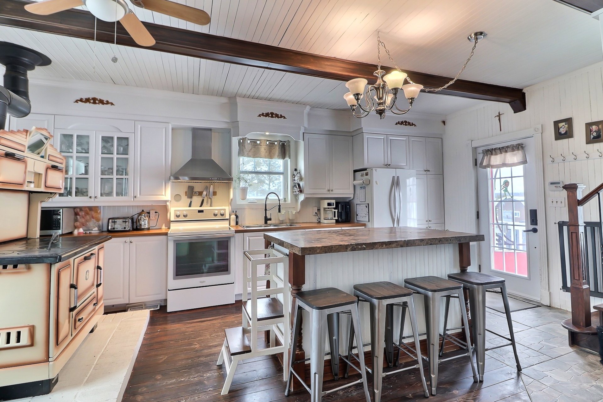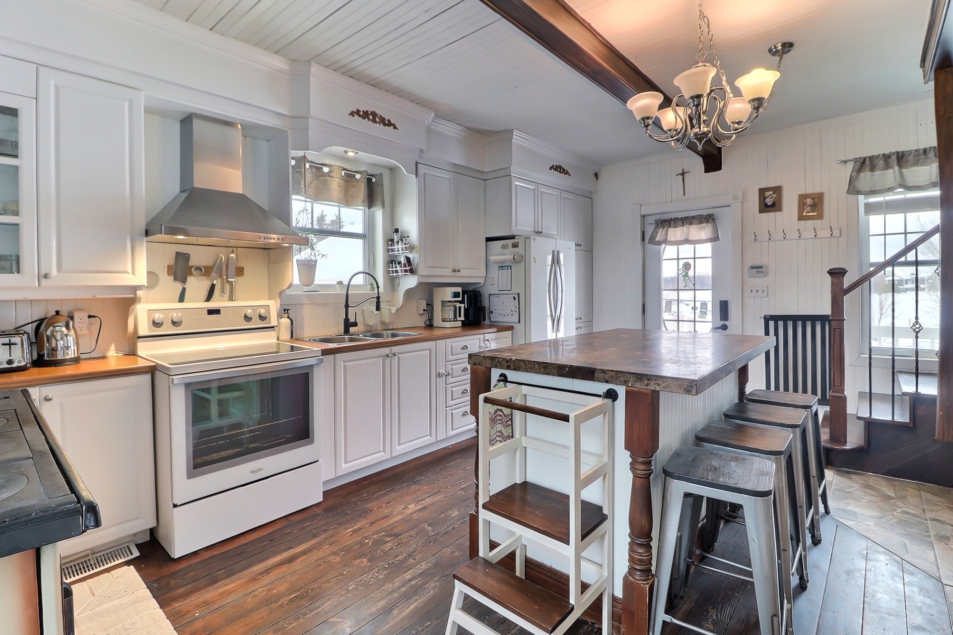 Pôles à rideaux, stores, lave-vaisselle (2025), bac à poubelle, bac recyclage, machine à eau, restant de matériaux de construction, panneaux de osb pour une portion des chevrons habitables du garage, possibilité barrières pour enfants. Rampe en pvc pour la gallerie.